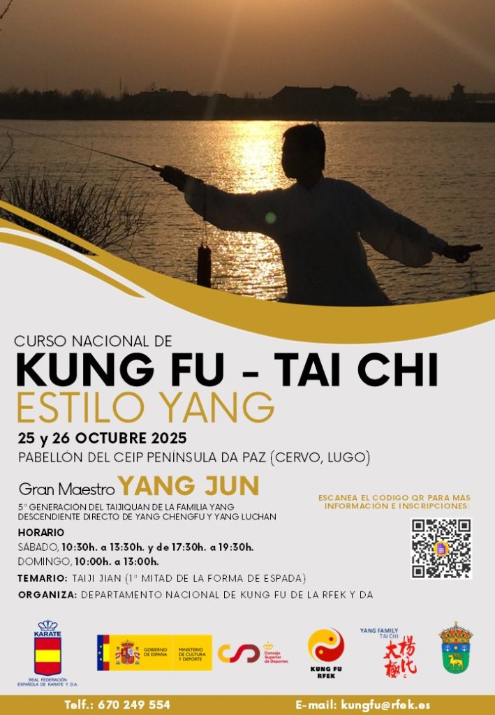 El próximo 24 de enero de 2026 el Departamento Nacional de Kung Fu organiza un curso de Kung Fu Taiji Quan que será impartido por el Director Nacional, Miguel Ángel Rojo Darriba. Estará centrado en el estilo de Wudang. Horarios, tasas, programa y más info en el cartel.